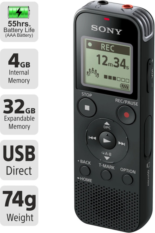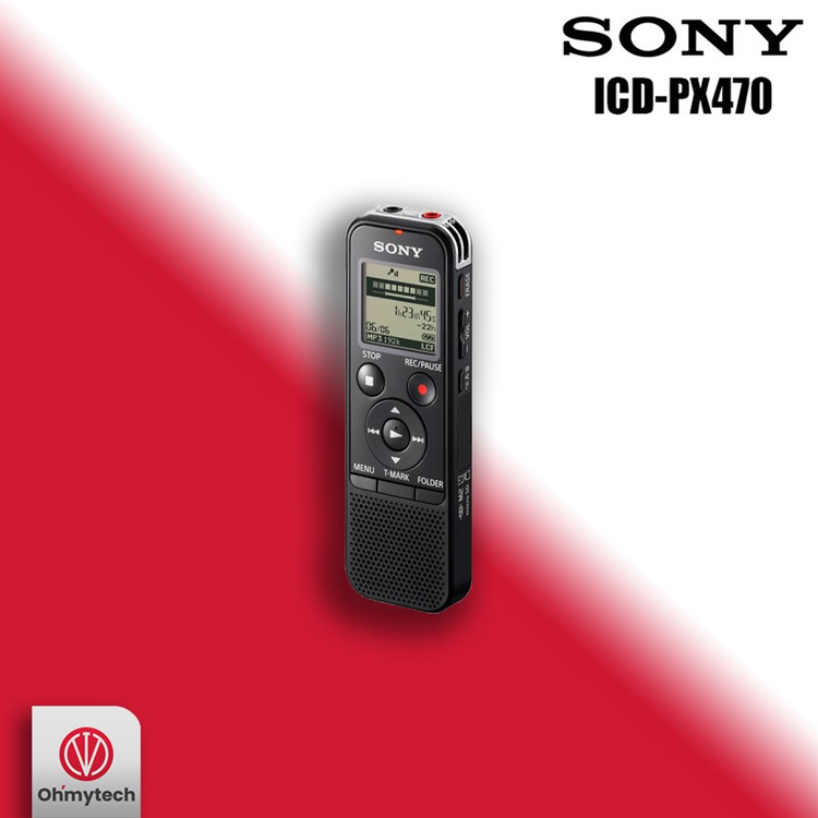 مدل «ICD-PX470» ضبطکنندهی صدای «سونی» (Sony) است. این مدل، فایلهای صوتی را با فرمتهای MP3 یا L-PCM ذخیره میکند؛ همچنین این ضبطکننده فایلهای موسیقی را با فرمتهای MP3 - WMA - AAC -LC - L-PCM پخش میکند. درنتیجه همانند یک پخشکنندهی موسیقی، برای کاربرانش کارایی دارد. برای نظم و ترتیب بخشیدن به اطلاعات ذخیرهشده در این مدل، در هر فولدری که ایجاد میکنید، حداکثر 199 فایل ذخیره کنید. این مدل، با بهرهمندی از 4 گیگابایت حافظهی داخلی، قادر است حداکثر 5000 فایل صوتی ذخیره کند. میزان صدای قابل ضبط، به کیفیت انتخابشده بستگی دارد. برای انتقال فایلها به کامپیوتر، این ضبط کننده، مجهز به یک پورت USB است. همچنین، برای اتصال انواع هدفون به این ضبط کننده، در قسمت بالای بدنه، یک عدد جک 3.5میلیمتری تعبیه شده است. برای اینکه فایلهای ضبط شده، از کیفیت بالاتری بهرهمند باشند، شما میتوانید، میکروفونی را جداگانه تهیه کرده و آن را از طریق جک مخصوص، به این ضبطکننده متصل کنید. کارکردن با دستگاه از طریق دکمههای روی بدنه، بسیار ساده بوده و تمامی کاربران بهراحتی میتوانند از امکانات آن بهرهمند شوند. گفتنی است که منبع تغذیهی این دستگاه، 2 عدد باتری نیمقلمی (AAA) است. با این باتریها میتوانید از 55 تا 62 ساعت، بنا به فرمت و سرعت ضبط صدا، از دستگاه بهرهمند شوید. بدنهی این محصول ابعاد جمعوجوری دارد و رنگ آن مشکی است. ICD-PX470 دستگاه پرکاربردی است که امکانات مناسبی را برای کاربران فراهم میکند. همچنین همراه این محصول یک عدد میکروفون ایرفون سونی نیزهست که قابلیت ضبط تماس، صدا و غیره را دارد.
