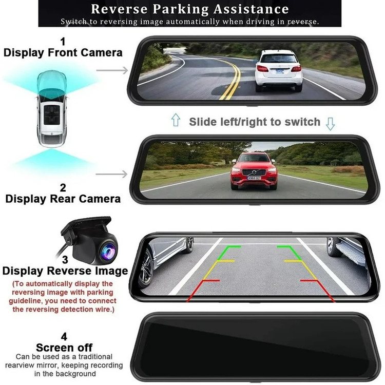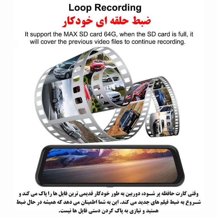 یک آینه دوربین دار تمام عیار بار رزولوشین تصویر 1080 و 4K که قابلیت اتصال گوشی اندروید و آیفون شما به آن را دارد. این قابلیت که Carplay نام دارد بسیار کاربردی بوده و شما میتوانید با اتصال گوشی خود از طریق بلوتوث از قابلیت های مشترک گوشی و این دستگاه روی آینه استفاده کنید. نسل جدید دوربین های ضبط وقایع که به شکل آینه ای طراحی شده اند بسیار کاربردی تر و کاملتر از نسل قبلی یعنی Dashcam های معمولی میباشد و علاوه بر کارایی اصلی آن که ضبط دائم تصاویر میباشد قابلیت های بسیار دیگری در اختیار راننده قرار داده است.این آینه دوربین دار دارای یک مانیتور تمام صفحه 9.66 اینچی میباشد و سطح رویی آینه به صورت کامل دارای نمایشگر یکپارچه میباشد که تصویر بزرگ و واضحی را در اختیار شما قرار میدهد. اسکیرین این آینه به صورت تاچ و از نوع IPS و دارای رزولوشن 4K میباشد که خیال شمارا از بابت یک صفحه نمایش با کیفیت راحت میکند. این آینه دارای ارتباط WIFI و بلوتوث بوده و به راحتی میتوانید علاوه بر چک کردن تصاویر ضبط شده بر روی نمایشگر آینه از طریق اپلیکیشن گوشی نیز آن را بازبینی کنید. ضمن اینکه میتوانید از قابلیت CarPlay موجود روی این آینه که در واقع روی اکثر اینه های موجود در بازار نیست برای اتصال و انتقال تصویر گوشی روی آینه استفاده کنید. به اینصورت که شما میتوانید با استفاده از آینه گوشی خود را کنترل کنید ، تماس بگیری ، اپلیکیشن مکان یاب را راه اندازی و استفاده کنید . دوربین جلو و عقب این دستگاه از نوع 7 لایه و دارای قابلیت تصویر برداری 170 درجه ای میباشد که در نوع خود بسیار عالیست! ضمن اینکه دوربین عقب ضد آب بوده و هر دو دوربین ها دارای قابلیت دید در شب میباشند. این آینه ثبت وقایع دارای جی سنسور ( G-Sensor ) بوده و همچنین قابلیت Loop recording را دارد که باعث میشود هیچ وقت حافظه رم شما پر نشود . دوربین عقب خودرو کاملا قابلیت استفاده به جای آینه عقب خودرو را دارد و دارای قابلیت ریورس میرور بوده که تصویر را همانند آینه به شما نمایش میدهد.این آینه دارای لوازم مورد نیاز جهت نصب دقیقا روی آینه فابریک خودروشما دارد و به سادگی بدون نیاز به تعویض یا تغییر آینه خودرو خود به صورت فابریک روی آینه قبلی در چند ثانیه نصب میکنید!محصول دارای مموری 64 گیگ بوده.