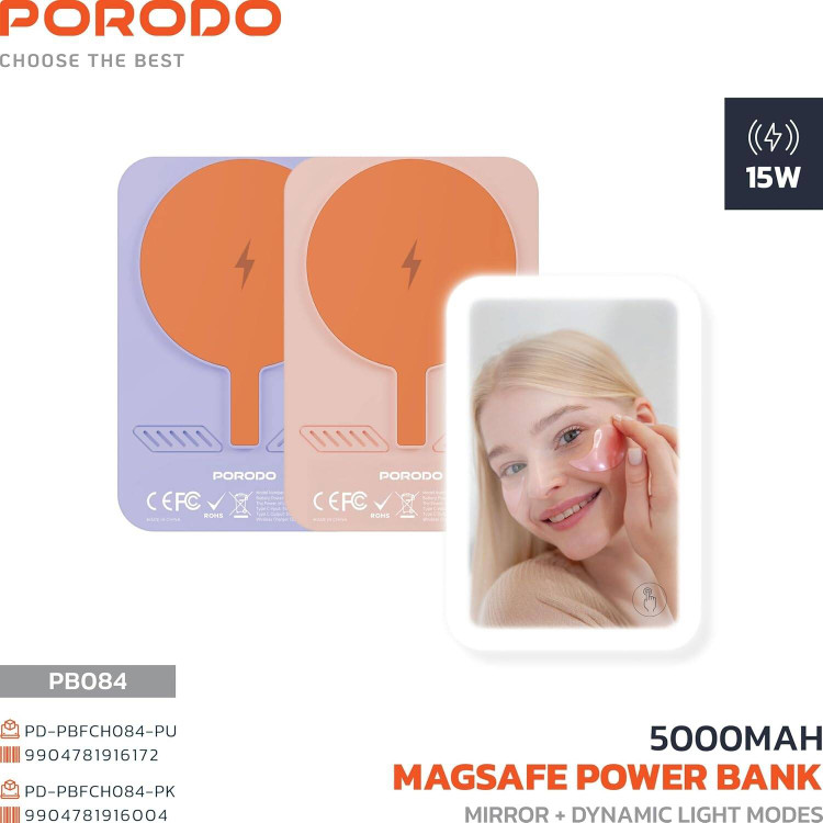 پاوربانک Porodo 5000mAh MagSafe با آینه حالتهای نوری پویا، ظرافت را با کاربرد ترکیب میکند و متناسب با نیازهای شارژ شما طراحی شده است. این پاوربانک با باتری 5000 میلیآمپرساعتی، از شارژ سریع پشتیبانی میکند و آماده است تا دستگاههای شما را در حین حمل و نقل شارژ کند. ورودی USB-C با توان 18 وات، امکان شارژ سریع را فراهم میکند، در حالی که خروجی USB-C، انتقال منظم برق 5 ولت/3 آمپر را تضمین میکند. دستگاههای مختلف از ویژگیهای شارژ بیسیم (5 وات، 7.5 وات، 10 وات، 15 وات) آن بهرهمند میشوند. آهنربای قوی امکان اتصال محکم به دستگاههای دارای MagSafe را فراهم میکند و شارژ بدون دردسر را تسهیل میکند. آینه حالتهای نوری پویا، سه نمایشگر نوری منحصر به فرد را به نمایش میگذارد و زیبایی پاوربانک را افزایش میدهد. چه در خانه، میز یا در سفر باشید، پاوربانک Porodo 500mAh MagSafe یک شارژر مسافرتی بینظیر است.