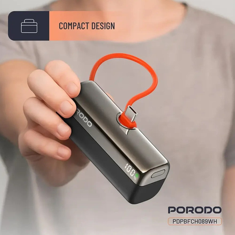 پاوربانک Porodo Pocket Volt 5000 mAh (مدل PDPBFCH090) یک شارژر همراه با ظرفیت بالا و طراحی جمعوجور است که مناسب استفاده روزانه و سفر میباشد. با ظرفیت 5000 میلیآمپر ساعت میتواند گوشی یا تبلت شما را چند بار شارژ کند. این پاوربانک مجهز به پورت USB-C و USB-A و تکنولوژی شارژ سریع Power Delivery است و توان خروجی تا 22.5 وات را پشتیبانی میکند. نمایشگر دیجیتال آن میزان دقیق شارژ باقیمانده را نشان میدهد و حمل آن با وزن حدود 200 گرم آسان است.