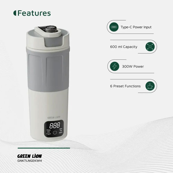کتری برقی گرین لاین Green Lion Kettle & Go ، دارای ظرفیت جوشاندن آب تنها 600 میلیلیتر می باشد. این کتری از جنس PP محکم و استیل ضد زنگ 304 است و مطمئناً مدت زیادی دوام خواهد داشت. برای ورودی برق، میتوان از پورت Type-C یا 3 پین DC استفاده کرد. عملکرد چند منظوره آن را برای نیازهای گرمایشی مختلف تقویت میکند. با قدرت ۳۰۰ وات و ولتاژ ۲۲۰ ولت~، آب را در حدود ۷-۸ دقیقه به جوش میآورد. طول سیم رابط 65 سانتیمتر با دوشاخه UK در یک سر خواهد بود. این کتری Green lion دارای نمایشگر دما و قابلیت کنترل لمسی برای سهولت کار است. حالت گرم نگه داشتن و خاموش شدن خودکار به ایمنی شما میافزاید. ویژگیها کتری شامل محافظت در برابر جوش آمدن آب و دهانه بدون چکه برای اطمینان از کارایی و تمیزی بالای کتری است. اطلاعات درجشده در شرح کالا از جمله نام مدل ، طرح یا تعداد و... با عنوان فارسی یا مشخصات فنی مغایرت دارد. لطفاً تمامی بخشها را بررسی و اصلاح کنید.