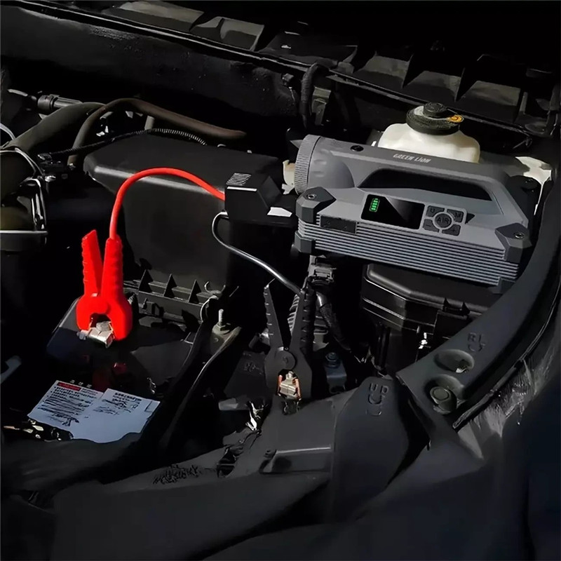 روی بدنه ی جامپ استارتر قابل حمل گرین Green JX66 Jump Starter کلیدهای برای کنترل این محصول در نظر گرفته شده و بعلاوه یک نمایشگر بزرگ داده های واضح برای وضعیت باتری، فشار پمپ و ولتاژ، سهولت استفاده را تضمین می کند جامپ استارتر Green Lion JX66 یک گجت قدرتمند و قابل اعتمادی است که شما را برای هر موقعیتی آماده نگه می دارد. این دستگاه دارای سه عملکرد در طراحی کوچک می باشد. این یک پاوربانک PD 65 وات، یک پمپ هوا با 150 PSI و یک جامپ استارت است. انرژی همه آنها توسط یک باتری قوی 24000 میلی آمپر ساعتی تامین می شود.پاوربانک: Green Lion JX66 Jump Starter دارای ظرفیت 24 هزار میلی آمپری و 2 درگاه USB و USB-C بوده با توان کلی خروجی 65 وات PD بوده که می توانید در صورت نیاز از این درگاه ها برای شارژ دستگاه های خود استفاده کنید. هر کدام از پورتهای پاوربانک Green Lion JX66 Jump Starter دارای توانهای زیر هستند که برای مواقع اضطراری و ماجراجویی در فضای باز بسیار مناسب است. جامپ استارتر گرین لاین JX66 Jump Starter از نظر مدارهای الکتریکی و از نظر کابل ها، برای جریان های بسیار بالای لحظه استارت خودرو طراحی و تولید شده تا بتواند در مواقع اضطراری که باتری ماشین ضعیف شده یا اصطلاحا خوابیده، موتور ماشین را استارت بزند. این جامپ استارتر می تواند با ولتاژ 12 ولت و حداکثر جریان 6000 آمپر را تولید کند. پمپ باد گرین لاین JX66 Jump Starter قادر است در صورت نیاز چرخ ماشین شما را باد کند. این دستگاه قادر به باد کردن انواع وسایل بوده و فشار مورد نیاز آنها را به صورت پیش فرض در خود دارد. عملکرد آن به این صورت هست که پس از اتصال به وسیله مورد نظر با فشردن یک دکمه شروع به باد کردن و رساندن باد آن به میزان مناسب میکند. جامپ استارتر و پمپ باد قابل حمل گرین لاین مدل GNJX66JSTGY با چهار حالت باد کردن و سرعت جریان هوای قابل توجه 40 لیتر در دقیقه و فشار 150PSI باد کردن سریع و موثر را تضمین می کند.در قسمت جلویی جامپ استارتر قابل حمل گرین Green JX66 Jump Starter یک چراغ LED با توان 15 وات تعبیه شده که دارای 3 حالت است؛ شما می توانید از حالت های معمولی، SOS و فلش عادی استفاده کنید. شدت نور این چراغ برابر با 2000 Lumen است.در قسمت پشتی نیز یک چراغ مطالعه 5 وات وجود دارد