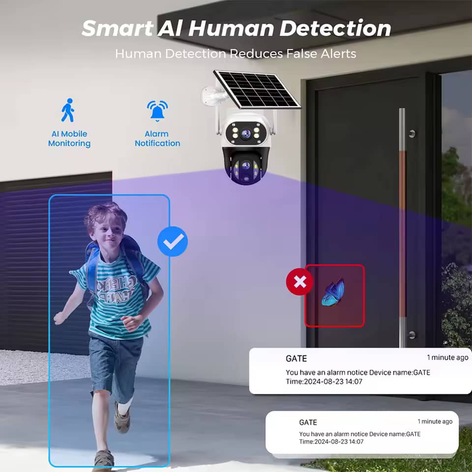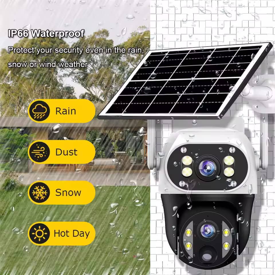 دوربین خورشیدی VS11-G-H سیمکارتخور برای امنیتی بیوقفه و بیدردسر می باشد. عملکرد تماموقت با انرژی خورشیدی بدون نیاز به برق یا سیمکشی، این دوربین با پنل خورشیدی خودکار شارژ میشود و هزینههای شما را کاهش میدهد در هوای ابری 3 روز شارژ نگهداری میکند. فقط یک سیمکارت کافی است برای دیدن تصاویر روی تلفن همراه در هر نقطه با قرار دادن یک سیمکارت داخل دوربین، میتوانید از هر نقطه به تصاویر زنده دسترسی داشته باشید و محیط خود را در نظر داشته باشید. با نصب یک مموری کارت به راحتی میتوانید فیلم ها را تا یک ماه و بیشتر ضبط کنید. مقاومت بالا با استاندارد IP66 را داراست. این دوربین در برابر باران، گردوغبار و شرایط جوی سخت مقاوم است، بنابراین برای فضاهای باز ایدهآل است. دو لنز حرفهای دارد که لنز ثابت با قابلیت تنظیم دستی برای پوشش دقیق نقاط خاص می باشد ولنز چرخشی 360 درجه که امکان کنترل کامل و نظارت بر تمام زوایا را فراهم میکند. دید در شب پیشرفته که حتی در تاریکی مطلق، تصاویر واضح و شفاف را ثبت میکند و همچنین قابلیت روشن نمودن چراغ هنگام مشاهده حرکت برای ضبط تصاویر رنگی در شب را دارا میباشد. کنترل و مشاهده از راه دور با اپلیکیشن موبایل v380 proمیتوانید به راحتی تصاویر را مشاهده کنید، دوربین را بچرخانید و هشدارهای حرکتی دریافت کنید. بهترین انتخاب برای باغها، ویلاها، مزارع و حتی مکانهای دورافتاده بدون نیاز به برق و کابل کشی می باشد تنها کافی است سیم کارت و کارت حافظه را در دستگاه قرار داده و پنل را در محلی که تابش آفتاب وجود دارد نصب کنید.