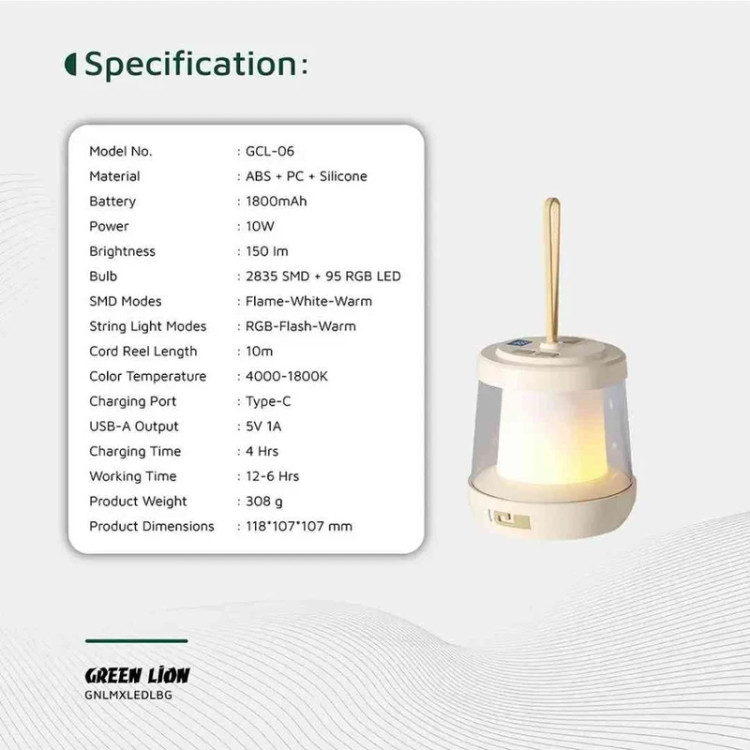 روشنایی هوشمند و زیبایی بینهایت را به ارمغان بیاورید. اگر به دنبال نوری هستید که نه فقط یک روشنایی ساده بلکه فضا را زنده کند یا اگر توی کمپ، مهمونی، اتاق خواب یا حتی بالکن، یه حس خاص و گرم به محیط اختصاص بدید ،Green Lion Lumex LED با ریسه داخلی ۱۰ متری دقیقاً همون چیزیه که باید داشته باشید. قدرت نور 150 لومن با 95 عدد LED RGB و SMD 2835 از مشخصات فنی این چراغ قوه هست. روشنایی چشمنواز، با رنگهای متنوع و قابل تنظیم برای هر حالوهوایی کاملا مناسب بوده و سه حالت نور اصلی: Flame (شعلهای)، White (سفید)، Warm (گرم) از فضای رمانتیک تا نور کاربردی همه در این دستگاه جمع شده است. ریسه ۱۰ متری با حالتهای RGB، چشمکزن و نور گرم مناسب برای تزئین، نورپردازی محیطی و خلق فضای خاص است. باتری داخلی 1800 میلیآمپری با شارژدهی 6 تا 12 ساعت فقط ۴ ساعت شارژ با پورت Type-C و خروجی USB-A برای شارژ معکوس هرگونه نگرانی از بابت مدت زمان کار رو برطرف میکند. بدنه مقاوم از ABS، پلیکربنات و سیلیکون و بند سیلیکونی قابل حمل سبک، بادوام و مناسب برای فضای باز، کمپینگ، سفر یا دکور داخلی است.
