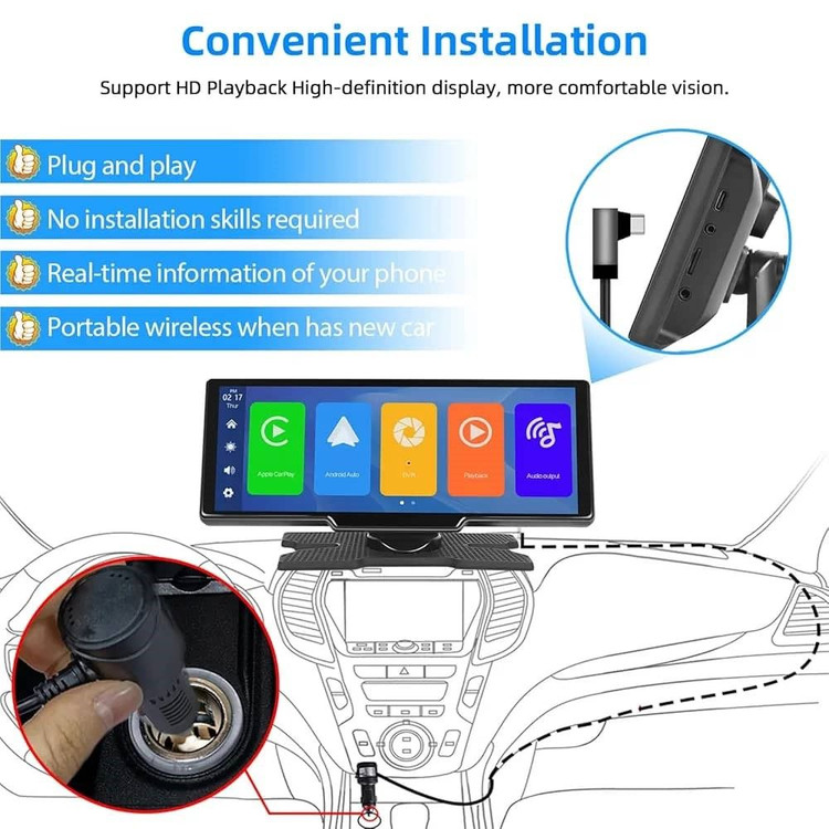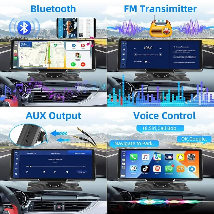 این دوربین ثبت وقایع دو لنز و پخش چند رسانه ای خودرو از Carplay بی سیم از طریق اتصال بلوتوث پشتیبانی می کند.می توانید مستقیماً از صفحه پخش بی سیم ماشین خود به برنامه ها، نقشه ها، تماس ها، AUX، FM، بلندگوها و بلوتوث دسترسی داشته باشید. صفحه نمایش 10.26 inch و لمسی با کیفیت فول اچ دی 1080Pکیفیت بسیار عالی را به ارمغان می اورد.کنترل صدا از طریق Siri/Google Assistant دسترسی به موسیقی، GPS و برقراری تماس، این نمایشگر خودکار اندروید تجربه رانندگی ایمن تر و راحت تری را برای شما فراهم می کند. ا اتصال تلفن هوشمند خود به صفحه قابل حمل کارپلی، صفحه نمایش ماشین Carplay موقعیت مکانی دقیق و ناوبری GPS را بدون تأخیر ارائه میکند. از Google Maps برای ارائه توصیههای مسیر در زمان واقعی برای ازدحام ترافیک و تغییر خطوط استفاده کنید. دسترسی فوری به آخرین اطلاعات ناوبری داشته باشید، بدون دردسر و بدون بهروزرسانی مکرر، مقصدها را جستجو کنید.سیستم عامل اندروید امکان نصب برنامه را فراهم میکند. دو دوربین جلو و عقب خودرو همزمان دو تصویر مجزا ذخیر میکند.دارای فندکی مخصوص دستگاه که از برق خودرو سواری تا خودروی سنگین جوابگوست همچنین دارای دو پایه اتصال به شیشه خودرو و داشبورد یک عدد کابی ای یو ایکس میباشد.