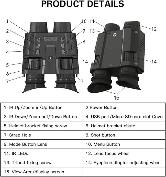 دوربین دوچشمی دید در شب مدل NV-8000 با قابلیت فیلمبرداری و عکسبرداری ، بسیار مناسب کوهنوردان ، گردشگران طبیعت ، ماجراجویان و ... میباشد که یک ابزار فوق العاده عالی میباشد که به شما امکان می دهد هدف را در تاریکی مطلق مشاهده کنید. ایده آل برای طیف گسترده ای از کاربردها مانند نظارت ، شکار شبانه ، مشاهده حیات وحش و امنیت و نظارت، کمپینگ، اکتشاف، ناوبری شبانه، شکار شبانه، نظارت بر حیات وحش، جستجو و نجات و... محسوب میشود. این دوربین های دوچشمی جمع و جور یک سیستم نوری کاملاً چند روکش عالی را با یک دوربین فیلمبرداری ترکیب می کند. دید در شب دیجیتال دارای عملکردهای واضح تر عکس برداری، ضبط ویدیو و پخش است. صفحه نمایش LCD به شما امکان مشاهده آسان و کنترل سریع عملکردهای مختلف را برای گرفتن عکس یا فیلم با کیفیت بالا می دهد. لامپ LED مادون قرمز 3 واتی داخلی، 850 نانومتر، هدف را در تاریکی کامل نظارت میکند و بردی معادل 800 متر در طول روز یا نور کم، و300 متر در شب را دارد .3 سطح مادون قرمز / 3 سطح روشنایی قابل تنظیم با توجه به نور محیط دارا میباشد. ویژگی کاملاً مهر و موم شده و پر از نیتروژن آن را در برابر مه و باران مقاوم می کند و می تواند از ورود رطوبت و گرد و غبار به مناظر جلوگیری کند. وضوح نوری فوق العاده دوربین دید در شب دیجیتال با عملکرد بالا با حسگر CMOS دید واضح تا بزرگنمایی 8 برابر را به دست می آورد. زوم دیجیتال 8X به کاربر این امکان را می دهد که روی یک شی بزرگنمایی کند یا برای نمای وسیع تر زوم کند. دیافراگم 31 میلی متری میدان دید وسیع تری را برای شما فراهم می کند. همچنین می تواند کامپیوتر را با کابل USB وصل کند . می توانید عکس ها و فیلم های خود را با خانواده و رسانه های اجتماعی خود به اشتراک بگذارید. ساپورت مموری کارت میکرو اس دی تا حجم 128 گیگابایت و کیف مخصوص حمل دوربین و وسایل جانبی دیگر خصوصیات این محصول میباشد.