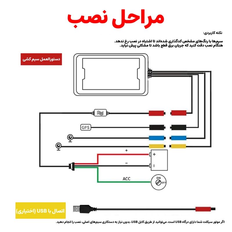 طریقه نصب: دوربین جلو و عقب را با براکتها روی محل مناسب نصب کنید، کابلها را به واحد مرکزی و برق موتور (DC ۵-۱۲V) وصل کنید، کنترل از راه دور و لوازم جانبی را نصب کرده و دستگاه را روشن کنید تا ضبط خودکار فعال شود، سپس اپلیکیشن را از گوگلپلی یا اپاستور نصب کنید، وایفای دوربین را روشن کرده و با رمز ۱۲۳۴۵۶۷۸ متصل شوید و از طریق اپلیکیشن ویدیوها را مشاهده، دانلود و تنظیمات دوربین را مدیریت کنید.