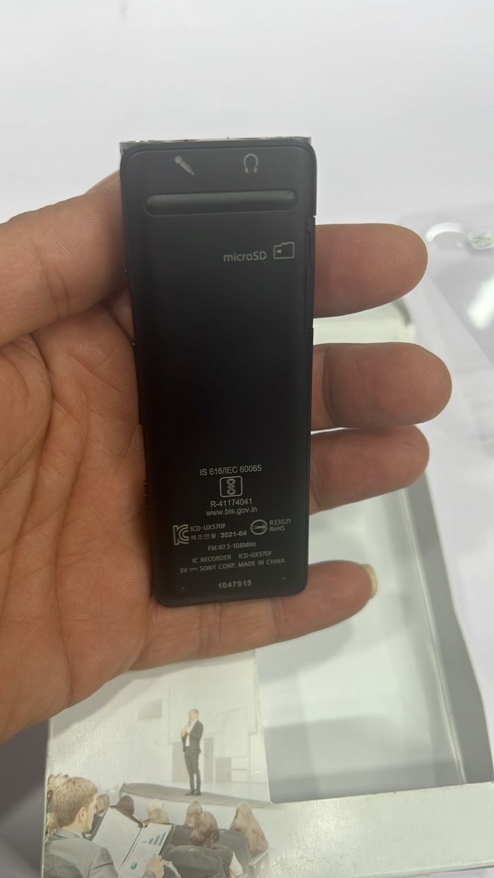 توجه داشته باشید محصول مقداری خش روی صفحه نمایشش هست چون داخل ویترین مغازه بوده .کاملا نو هست و استفاده نشده . عکس خود دتگاه رو گزاشتم .دستگاه های ضبط صدای سونی همیشه با استقال خوب در بازارهمراه بوده است. بی شک سونی قدرتمند ترین شرکت در بازار رکوردرها می باشد که در میان همه کاربران از جمله دانشجویان و اساتید ،خبرنگاران ، شرکت ها و ارگان های دولتی و موسسات خصوصی صدا و سیما و تمام کسانی که به دنبال ضبط صدای حرفه ای و قدرتمند با امکانات بالا می باشند از محبوبیت بالایی برخوردار است .رکوردرهای سونی دارای ویژگی های بارزی مانند ضبط خودکار (VOR)، نشانه گذاری پخش (T-MARK)، تکرار پخش (A-B Repeat)، جستجوی سریع (Easy Search) و پوشه بندی اطلاعات می باشند. ضبط صدای جدید سونی مدل ICD-UX570F با استفاده از 4 گیگابایت حافظه داخلی ، می تواند تا 59 ساعت با کیفیت MP3 128kbps (STEREO) ضبط کند. به علاوه ، می توانید با استفاده از کارتهای حافظه متناسب با رکوردر خود حافظه دستگاهتان را افزایش دهید .رکوردر ICD-UX570F کارت حافظه MicroSDHC را تا حداکثر 32 گیگابایت پشتیبانی میکند.انتقال فایل ها به رایانه بسیار سریع و راحت انجام می شود. برای اتصال فوری کافیست فقط قسمت USB (USB سرخود) رکوردر ICD-UX570F را مستقیماً به پورت USB کامپیوتر خود وصل کنید. برای انتقال اطلاعات به کابل USB احتیاجی نیست.ضبط صدای سونی مدل UX570 بسیا رسبک و نازک است ،این امر باعث میشود که این ضبط صدا همراه همیشگی شما باشد. صفحه نمایش ICD-UX570F نسبت به اکثر مدل ها بزرگتر بوده که این موضوع بازبینی و مدیریت فایل های ضبط شده را برای شما راحتتر میکند. در ضبط صدای UX570F فرکانس هایی که بر اثر حساسیت میکروفن از دست رفته اند، با استفاده از تنظیمات خودکار،فرکانس ها بهبود یافته که با وضوح و کیفیت بالایی ذخیره میشوند.شما میتوانید با استفاده از قابلیت Time Jump بصورت پرشی( 10٪ از کل زمان پخش یک ضبط )بخش مهمی را که در جستجوی آن هستید براحتی پیدا کنید. به لطف میکروفن-S میتوانید منابع صوتی ضعیف مانند صدای پرندگانی که در فاصله دور هستند را با کیفیت بالا و بطور طبیعی و واضح ضبط کنید.